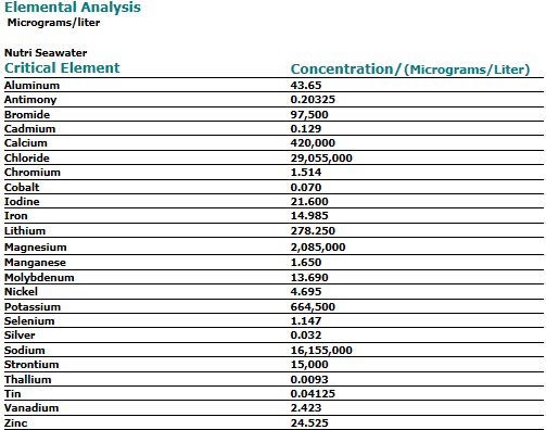 Answer:The essential elements of Nutri Seawater are as follows: Calcium, Iodine, Molybdenum,